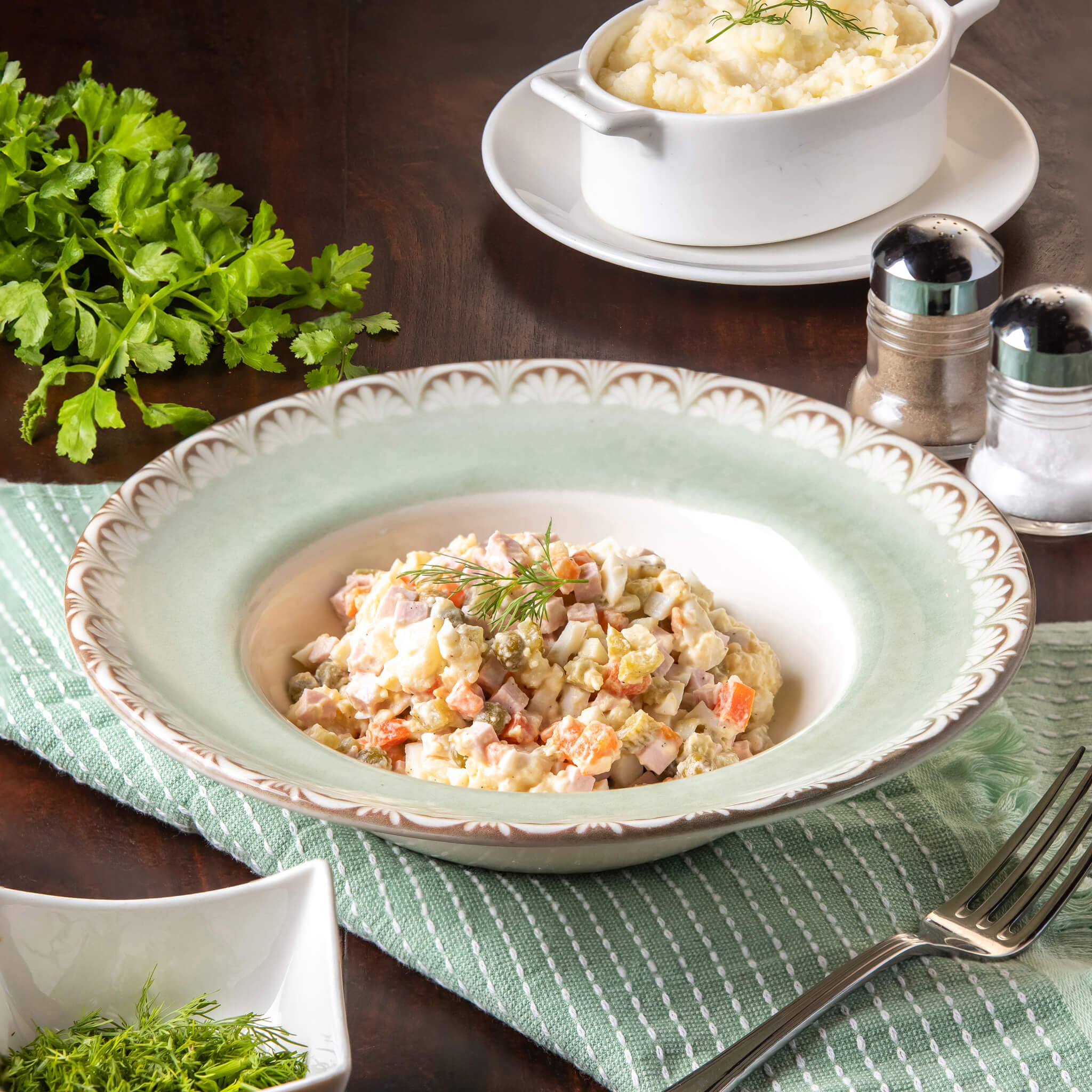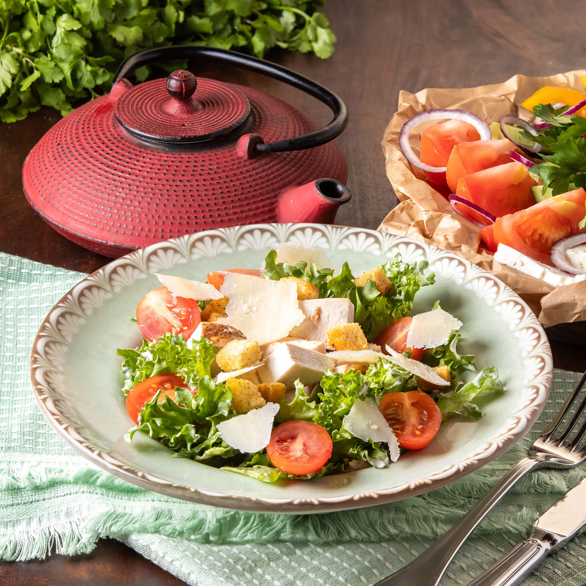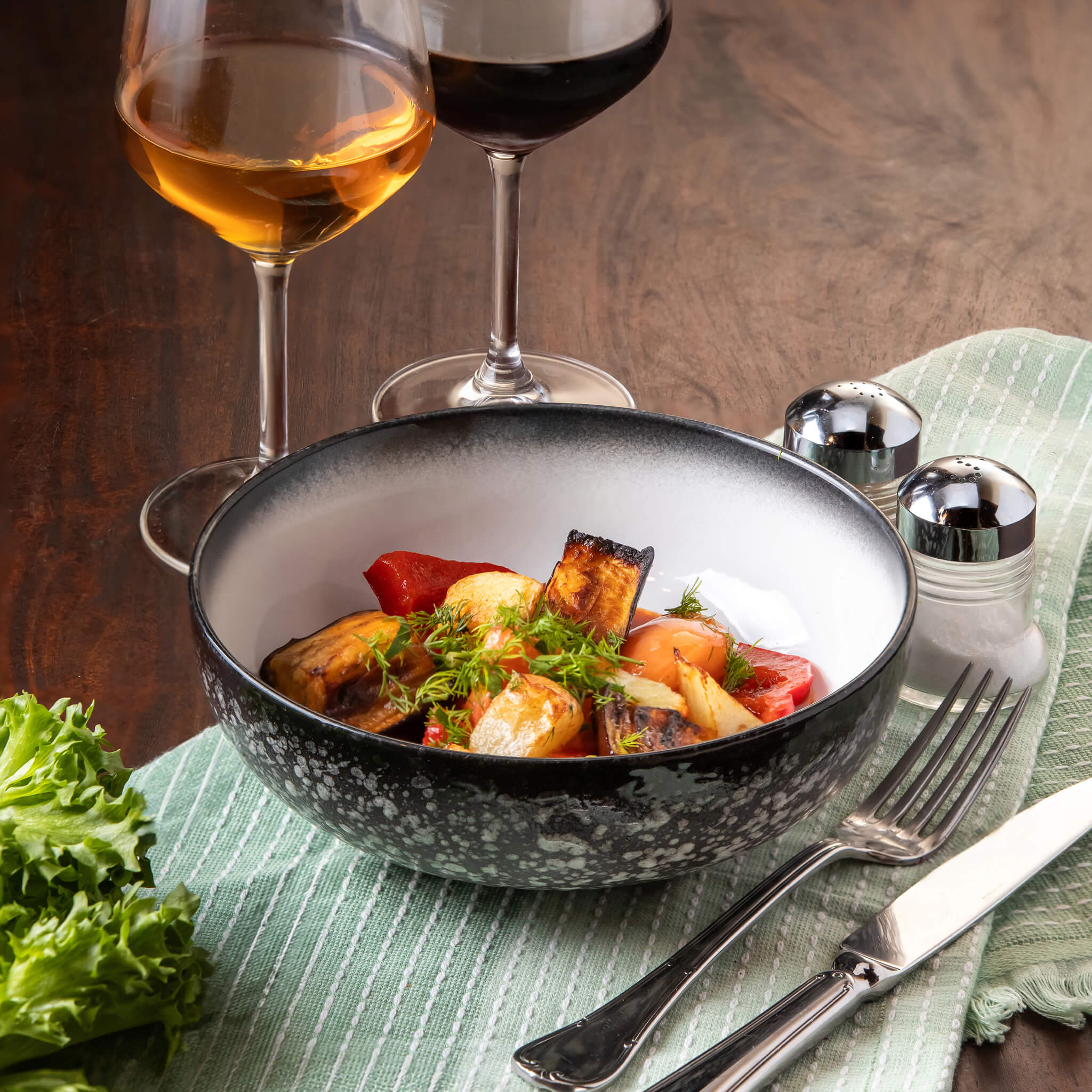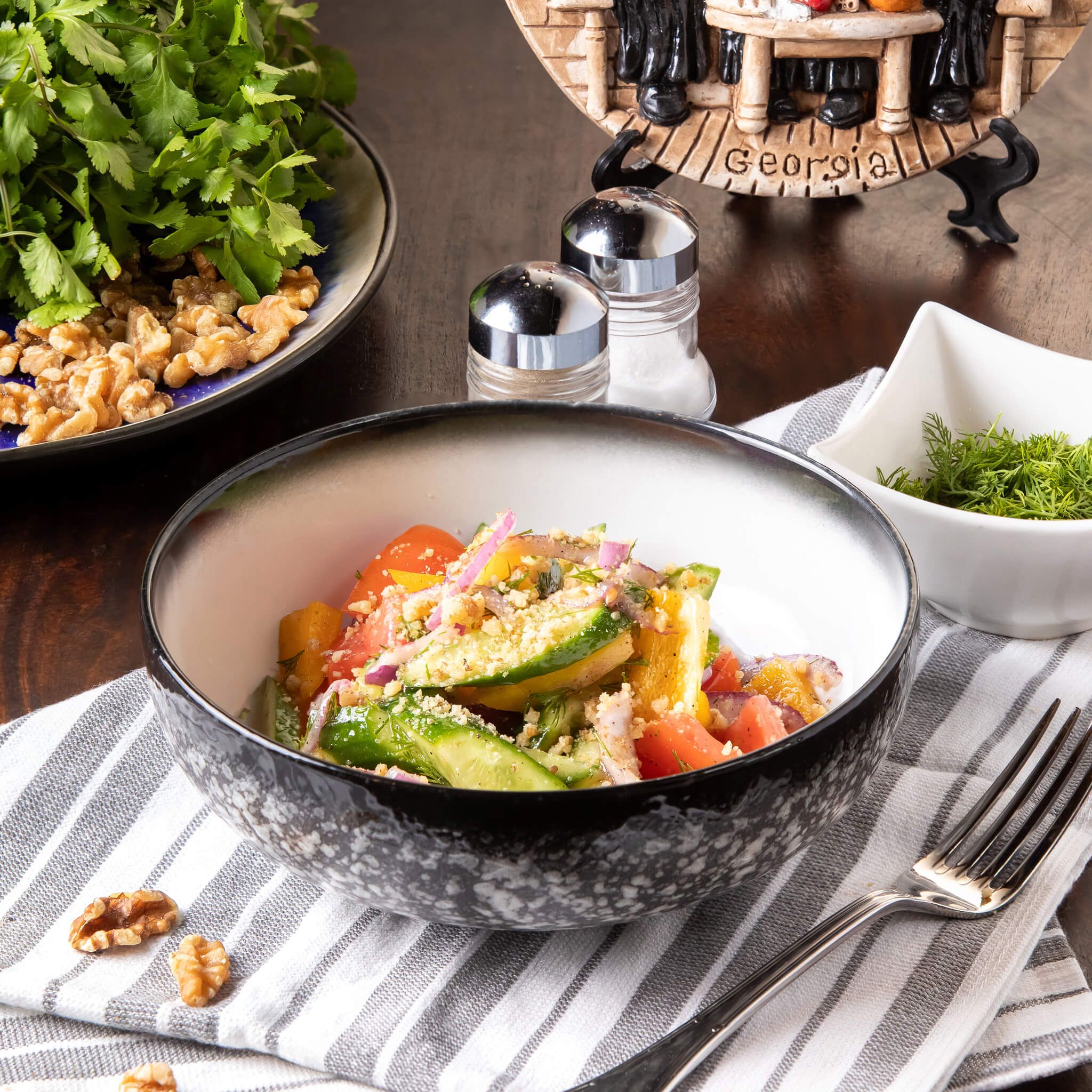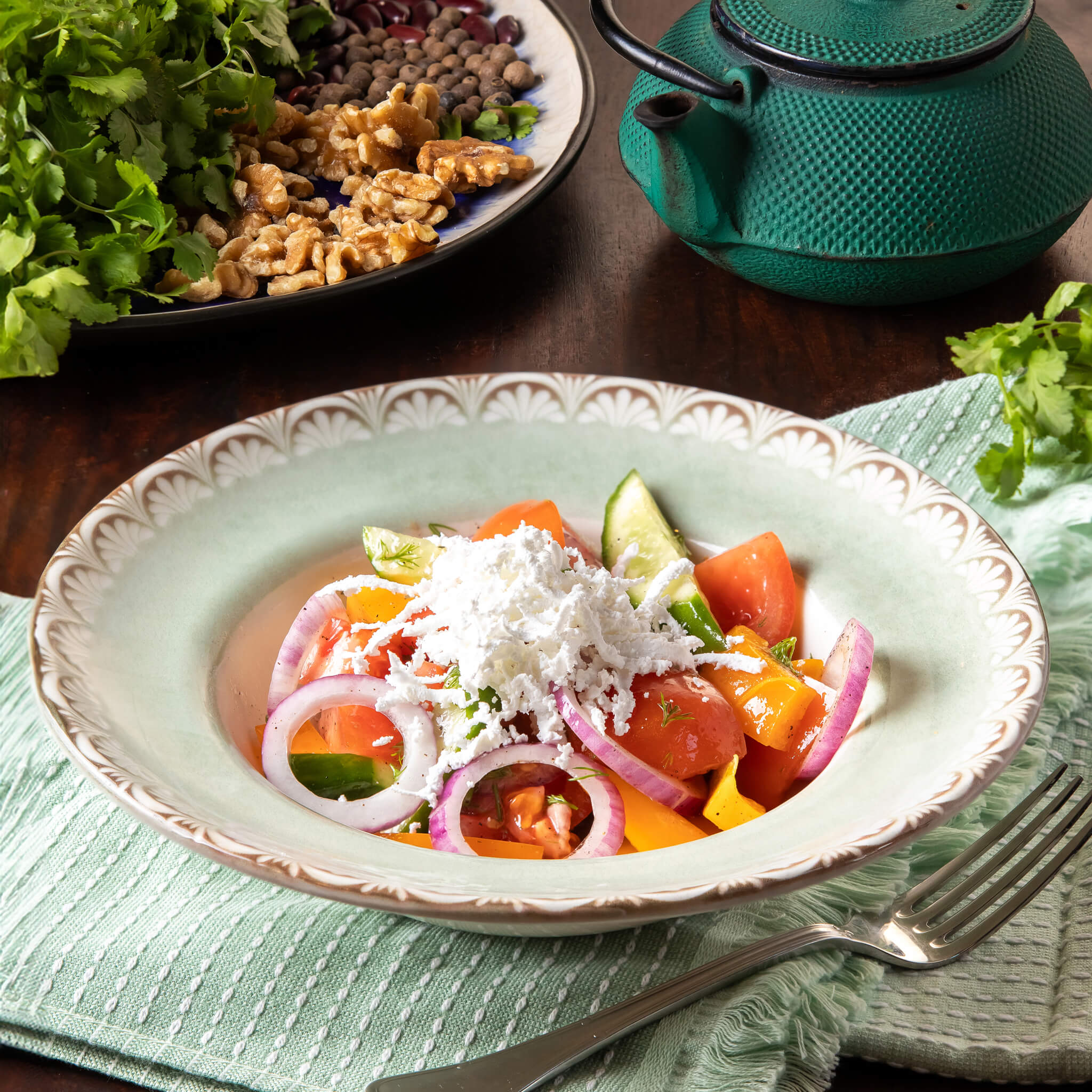 סלט ירקות חתוך גס. הרכב: מלפופון, עגבניה, גמבה, בצל אדום, ירק ואגוזי מלך, מתובל במיץ לימון ושמן זית.