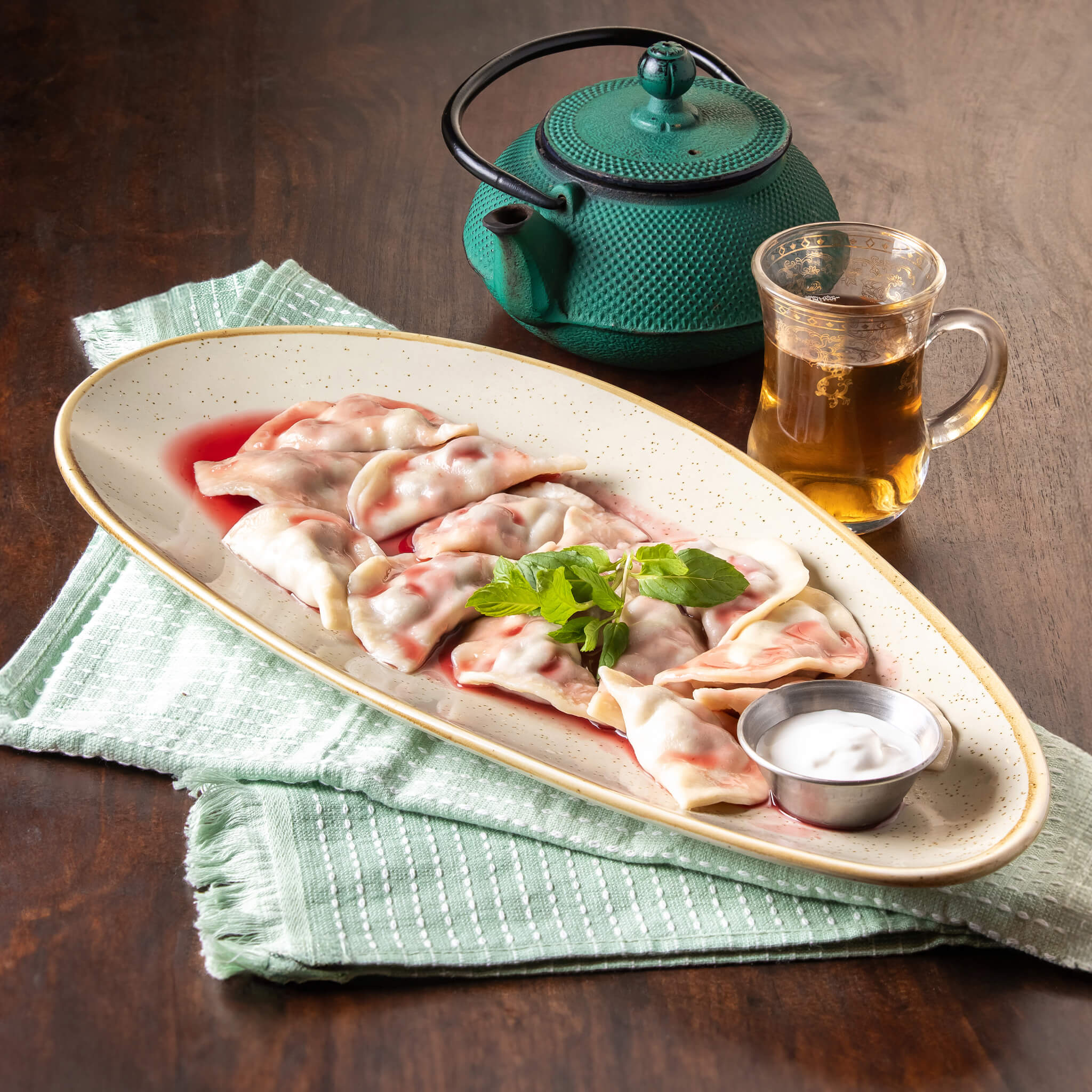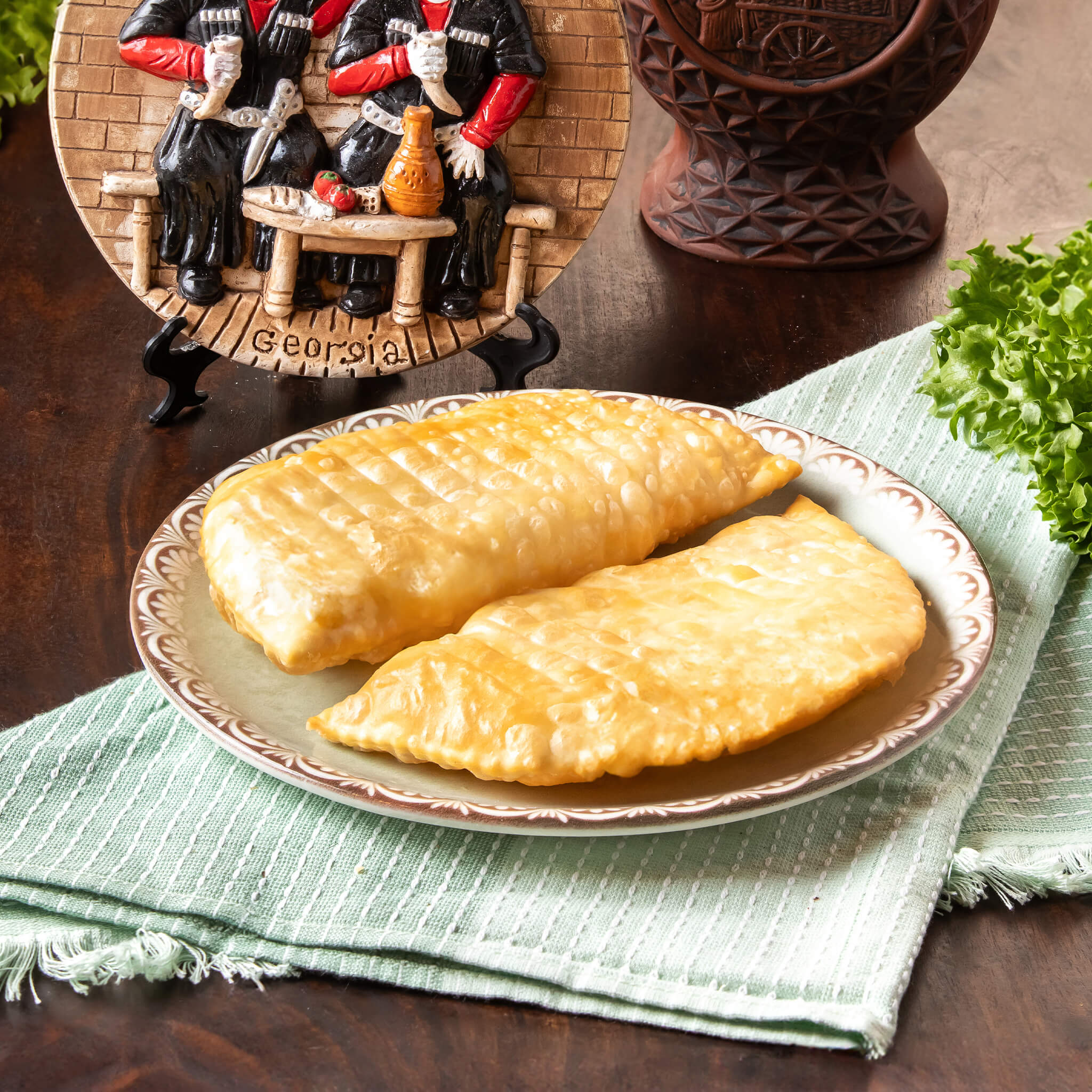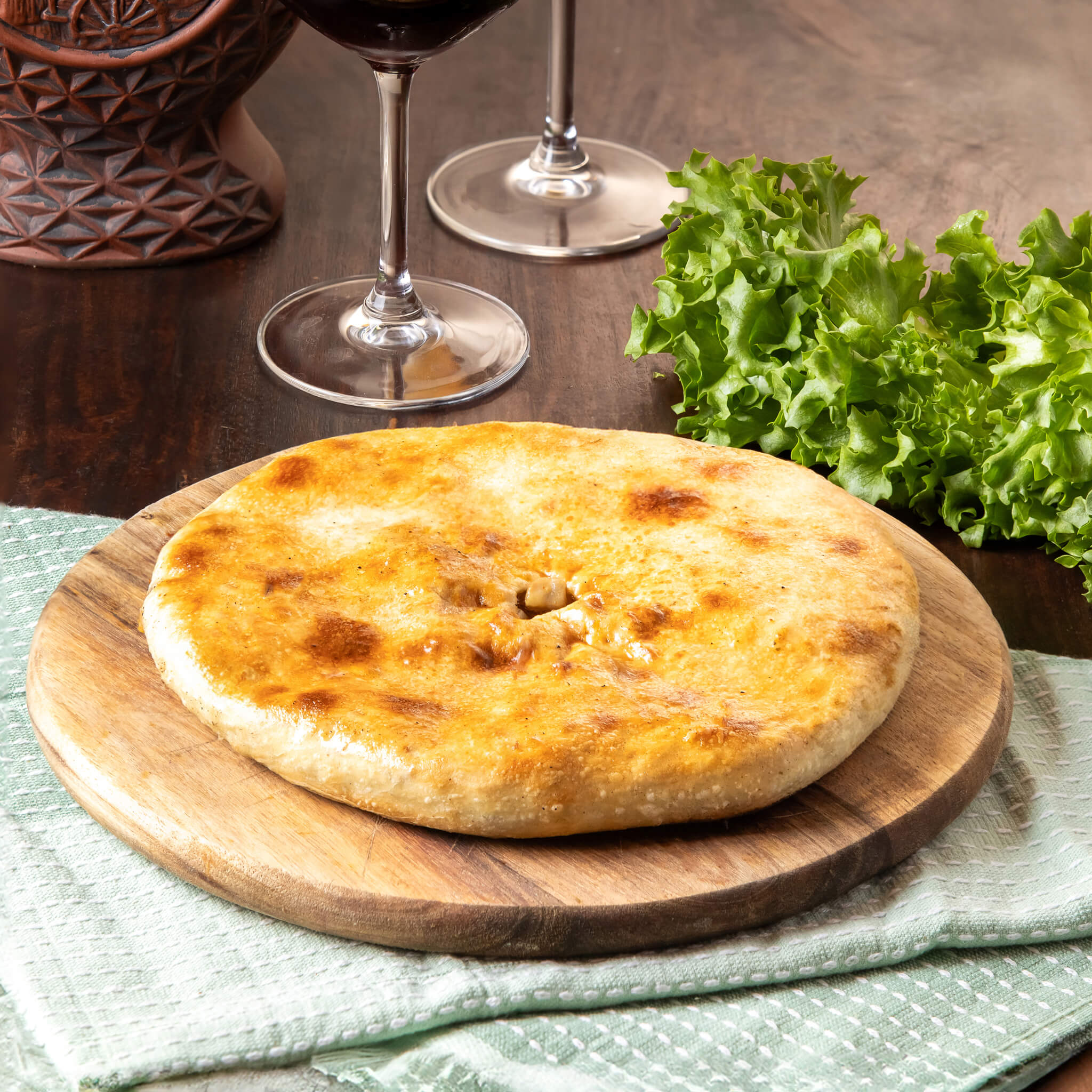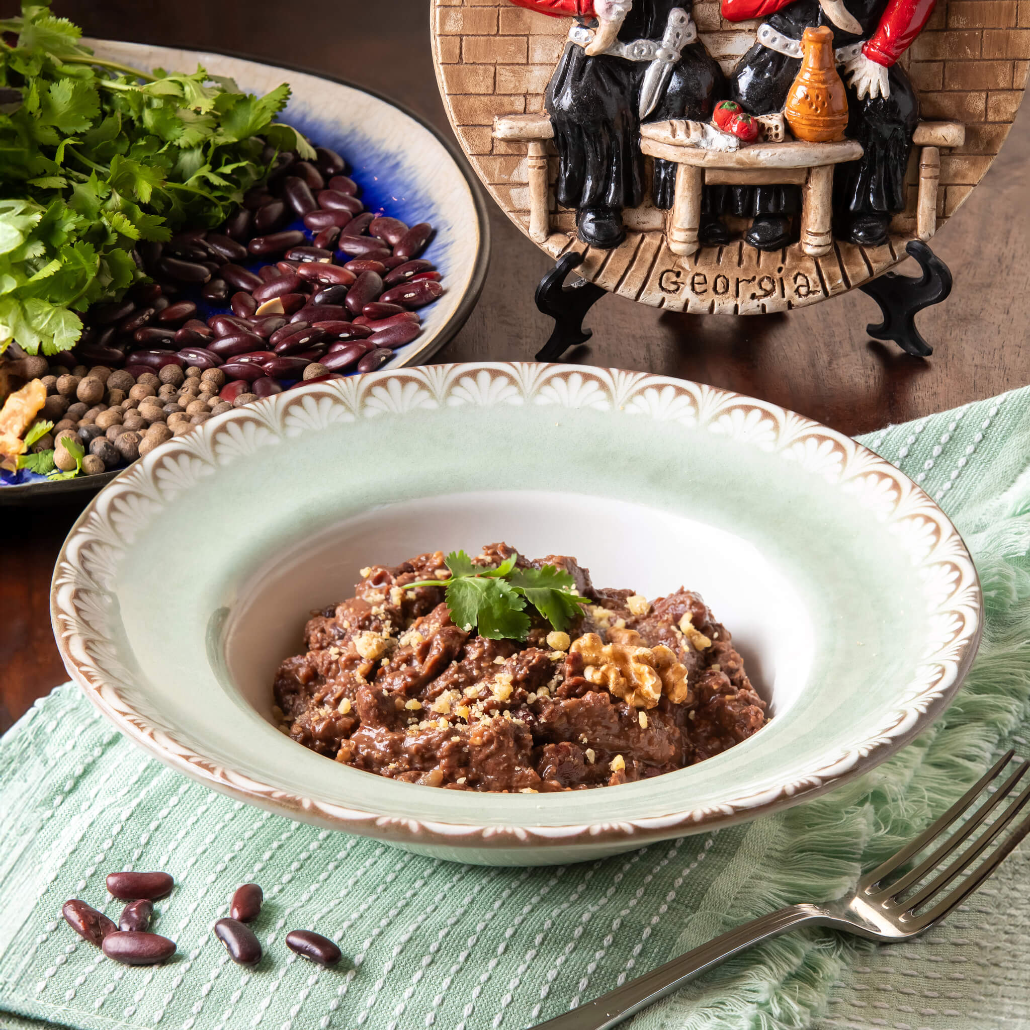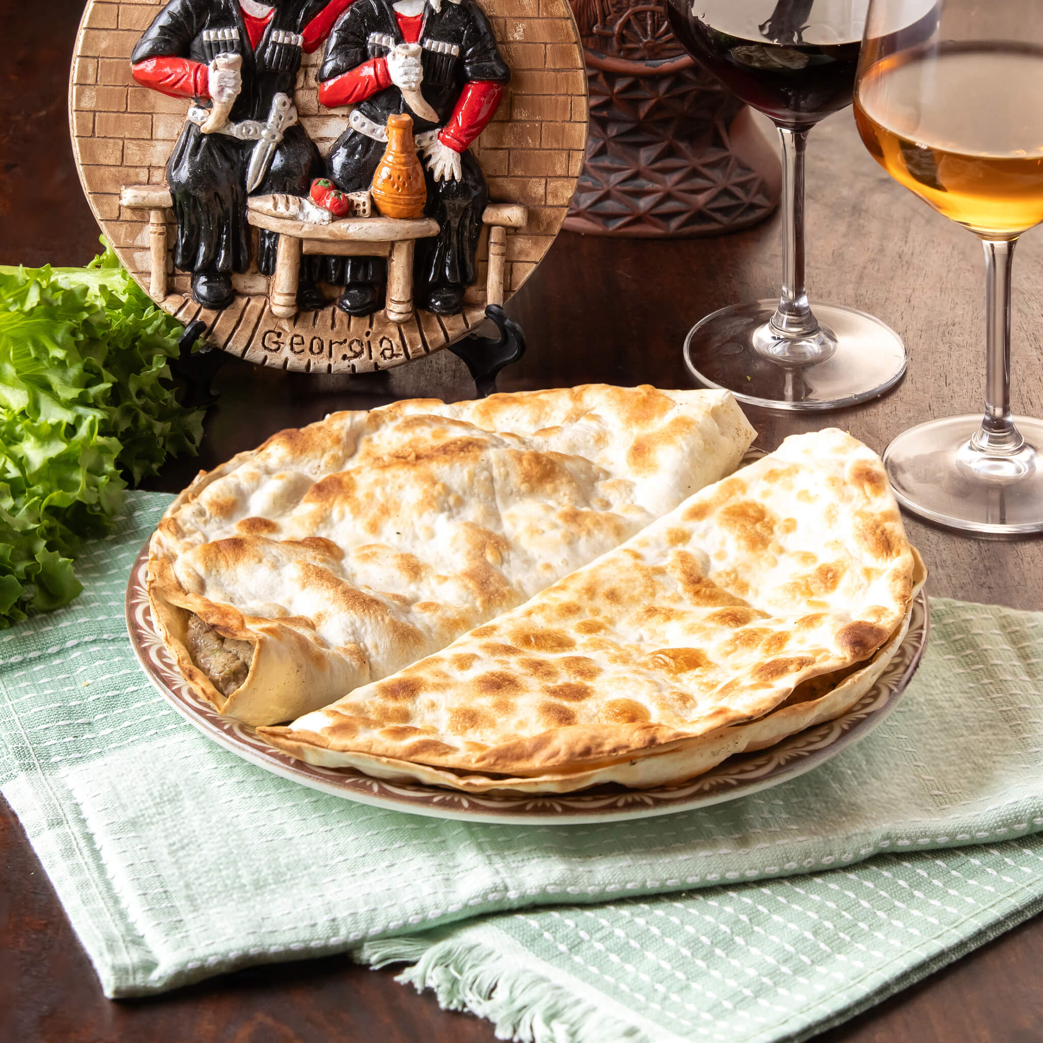 פחאלי של סלק אדום וחצילים מטוגנים מגולגלים במילױ עדין של תערובת אגוזי מלך ותבלינים גרוזינים מיוחדים .