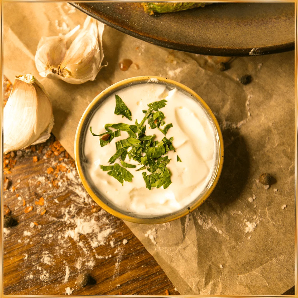 סלט חצילים מטוגנים, עגבניות וגבינה שמנת עם ירק (שמיר,פטרוזיליה, כוסברה ובזיליקום) מתובל ברוטב סױה, שמן זית, שום וצילי מתוק